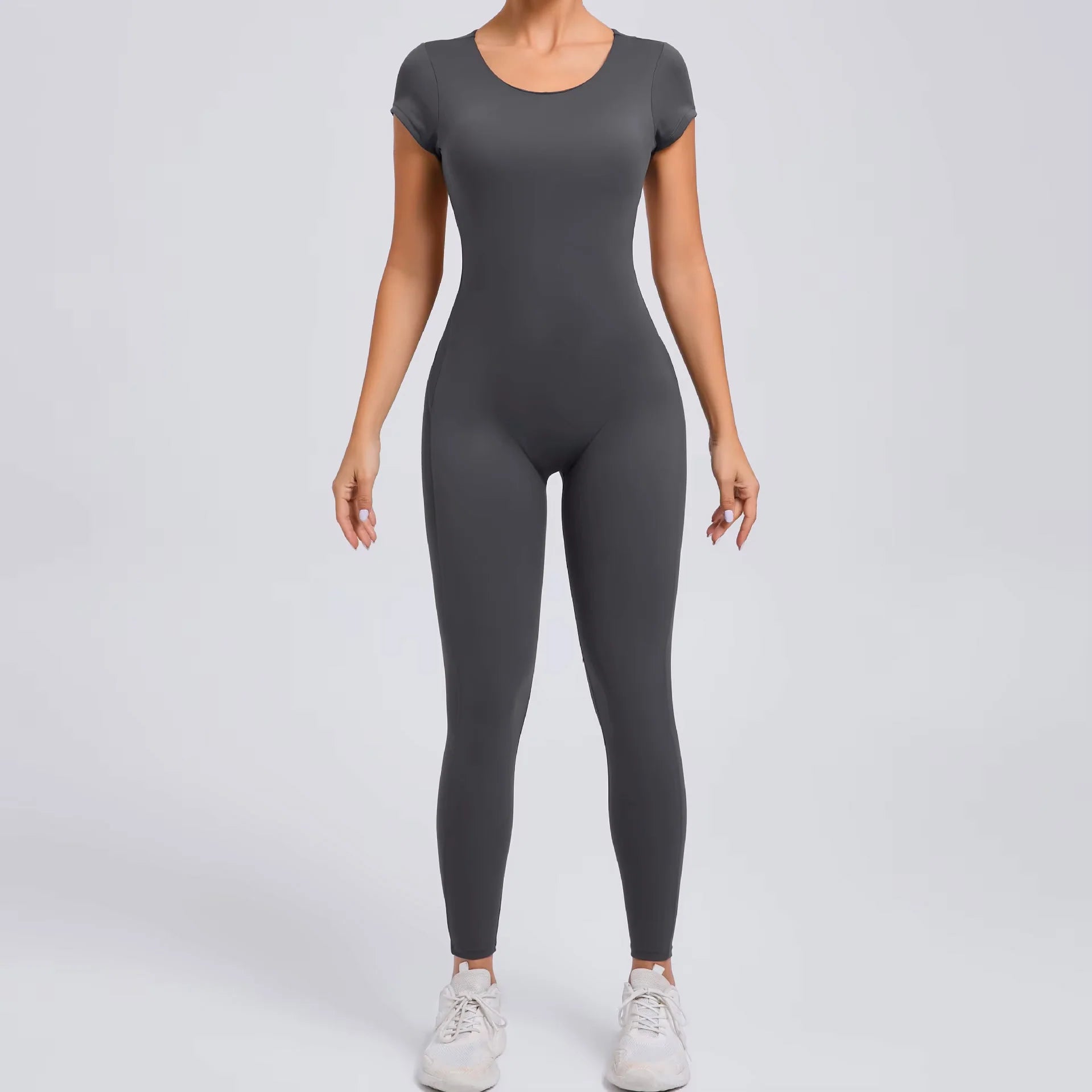 Open-Back Short-Sleeve Sculpt Jumpsuit - Full-Length Legging