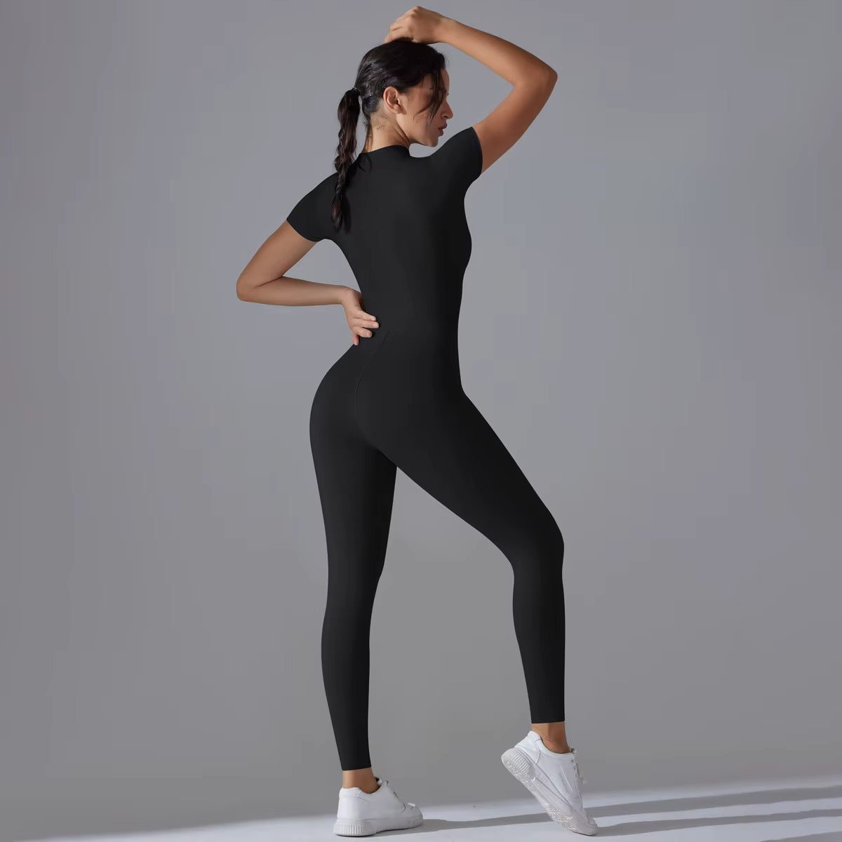 Features short sleeves and a functional front zipper for adjustable coverage, while the full-length legging design elongates the figure with a clean, minimalist aesthetic.